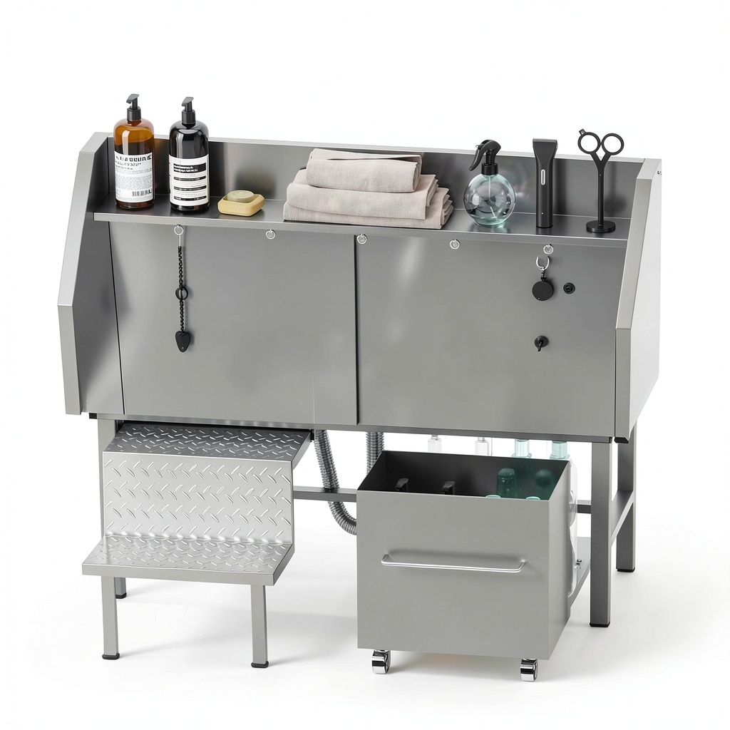 This dog washing station is ideal for both home environments and professional settings such as pet salons, grooming studios, and veterinary clinics. It accommodates medium to large breeds like Golden Retrievers and Huskies, providing a safe and comfortable space for bathing. The adjustable platform reduces strain on the groomer’s back, making it suitable for frequent use. Whether for daily pet care or commercial grooming services, the station’s efficient drainage and splash guards help maintain a clean workspace.